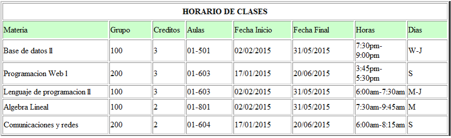 1. crear una tabla en Html5 con la hora, los dias de la semana y las clases que reciben por dia y en la parte superior debe aparecer horario de la clase y una imagen que tenga que ver con ingenieria o tecnologia de sistemas.